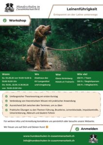 Zieht dein Hund an der Leine oder ist leicht abgelenkt? In unserem praxisorientierten Leinenführigkeits-Workshop lernst du, wie du mit den richtigen Techniken und Hilfsmitteln entspannte Spaziergänge genießen kannst.