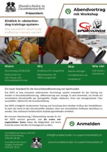 Bei unserem Abendvortrag / Miniworkshop werdet ihr mit der DDTS vertraut gemacht, und die ersten vier angemeldeten Teams haben die Möglichkeit, mit ihren Hunden die ersten Schritte Ersatzgeruch zu üben.
