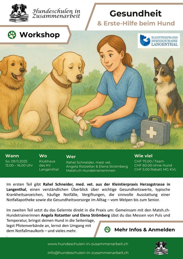 Ein gesunder Hund ist ein glücklicher Hund – und als Halter:in tragen wir massgeblich dazu bei, das Wohlbefinden unseres tierischen Begleiters zu fördern und zu erhalten. In unserem Workshop „Gesundheit und Erste-Hilfe beim Hund“ erfährst du, wie du die Gesundheit deines Hundes einschätzt und Veränderungen frühzeitig erkennst.